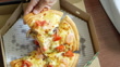 4K footage Close-up Top view, ฺBoy is holding a slice of pizza with tomato and cheese, pizza is cut in half and is placed in a cardboard box.