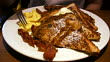 French Toast Breakfast with butter, syrup, bacon, and eggs on white plate.