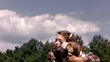 1940s low angle medium shot girl smiling at cam and leaning down to pet dog / pulling dog up - HD stock video