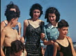 1940s pan teen girls in swimsuits with young boys posing on beach / home movie - stock video