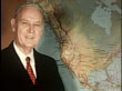 1950s CU, Professor John Donald Hicks, historian, in front of map of North America, Berkeley University, 1950's, California, USA