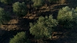 4k resolution, drone aerial point of view, of olive trees within olive grove. Close-up and tilt-up from single abundant olive tree within this large grove. The olive trees fill the entire frame and we see the trees planted out in neat rows Golden evening light bathes the landscape and the shot, casting long black shadows of olive trees onto the ground below. As we tilt-up from the single tree we see golden hills in the background, planted with eucalyptus and poplar trees, large boulders lie on the hillside.