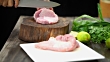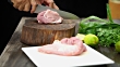 CU:a butcher slicing steaks off a slab of meat. - 4K stock video