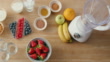 Above view of fresh fruit and blender for healthy breakfast smoothie. Strawberry, blueberry, raspberry, with apples, nuts and yoghurt in a flatlay in an empty kitchen. Getting ready to prepare drink