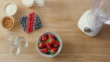 Above view of fresh fruit and blender for healthy breakfast smoothie. Strawberry, blueberry, raspberry, with apples, nuts and yoghurt in a flatlay in an empty kitchen. Getting ready to prepare drink - 4K stock video