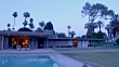 WS PAN across exterior mid-century Desert Modern 1955 celebrity home with swimming pool at dusk - HD stock video