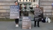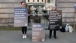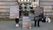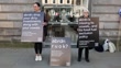 EDINBURGH, SCOTLAND - APRIL 24: Activists from Extinction Rebellion hold placards that read "abrdn: drop your dirty investments along with your vowels" and "abrn r u o k?" during a demonstration outside Abrdn's AGM on April 24, 2024 in Edinburgh, Scotland. Protesters gathered outside the annual general meeting of asset manager Abrdn today, criticising its financing of companies involved in fossil fuel expansion, including the Adani Group, a major coal developer. Abrdn is a significant investor in Adani's bonds. (Footage by Jeff J Mitchell/Getty Images)