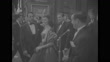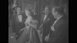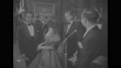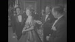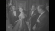 MS Actress Donna Reed waving outside Pantages Theatre, man at microphone talking as Reed waves to others