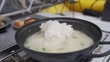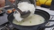 A close-up shot features a hand adding freshly cooked white rice to a simmering pot of creamy soup with green onions. This hearty meal provides comfort and delicious warmth.