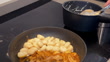 High angle close-up shot of senior woman adding gnocchi with cream into cooking pan with chicken stew in domestic kitchen