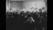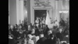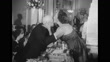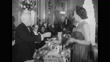 Title: "Adolph Zukor Honored By Britain's Film Industry" superimposed over Adolph Zukor, Chairman of the Board of Paramount Pictures Corp., cutting cake / WS guests in room of Mayfair Hotel / CU Zukor / WS guests arise to drink toast to Zukor/ MS Sir David Griffiths of the Kinematograph Renters' Society presenting Zukor with candlesticks / CU Griffiths presenting Zukor with candlestick, Zukor's wife Lottie in picture / WS cake, in the form of the Paramount Building, brought in / Side view actress Bebe Daniels kisses Zukor, hand rubbing his forehead / CU cake being cut / VS people shaking hands with Zukor / Note: exact day not known