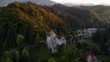 Aerial backward scenic shot of famous fortress on hill, drone flying backwards in residential town - Bran Castle seen from drone
