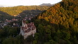 Aerial backward shot of famous national monument in town - Bran Castle seen from drone