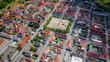 Detailed aerial close-up of the central square and grid layout of Neuf-Brisach, the UNESCO World Heritage fortress town, France. The symmetrical streets, red-roofed buildings, and historic architecture showcase classic 17th-century urban planning and military design surrounded by green fortifications. Neuf-Brisach (Neubreisach) in the department of Haut-Rhin in the region of Alsace in France. Camera ist orbiting to the right.