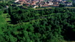 Aerial drone shot of a small walled town surrounded by farmlands - 4K stock video