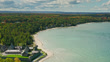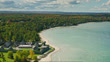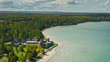 Aerial establishing shot of Mackinaw City taken by a drone flying over the beach on a cloudy day.