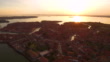 Aerial flying around the island of Murano in Venice, Italy, flying over the water with view looking over the beautiful island known for glass blowing with Venice city center in the distance, rooftops, buildings and houses, canals, boats, people, population, San Marco Square, St Mark's Campanile at the end of a beautiful clear day, magic hour, sunset