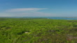 Aerial flying backwards while looking North over trees, houses and roads in Water Mill, Long Island New York towards Peconic Bay far off in the distance, beautiful clear day with view far off into the distance