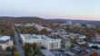 Aerial forward beautiful view of residential city by hills during sunset - Fayetteville city in autumn season
