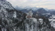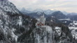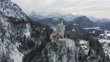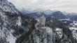 Aerial moving forward to Neuschwanstein Castle perched high on hill surrounded by soaring pines and jagged snowy mountain peaks on a gray and cloudy day - Aerials of Bavarian Castles