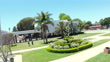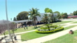Aerial moving low through a park and then panning and circling the statue of Myrna Loy in front of Venice High School under a bright blue sky, with grass and trees and people relaxing on the lawn - Low Aerials of Urban Parks