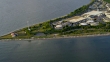 Aerial view West Point Lighthouse and Treatment Plant nr Discovery Park, Puget Sound, Seattle, Pacific Northwest, USA