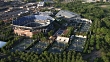 Aerial of Flushing Meadows Corona Park. Arthur Ashe Louis Armstrong Stadiums. tennis courts. parking lots
