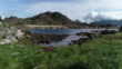 Aerial of landscape near Ballstad, Lofoten archipelago with cod drying on racks - 4K stock video