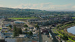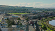 Right to left aerial of the Napa Valley Wine Train railyard with apartment buildings and rolling green hills in the background.