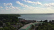 Aerial panning shot of buildings and vehicles in city by lake, drone flying over structures against sky - Aerial view of Lake Geneva in Wisconsin