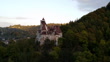 Aerial panning shot of famous historic castle on green hill in residential town - Bran Castle seen from drone