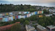 Aerial pull out from colourful houses of Clifton and the Avon Gorge, with Bristol City Hotwells and Clifton on an overcast day.
