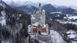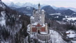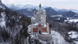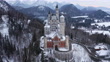 Aerial rising above the famous Neuschwanstein Castle perched high on hill surrounded by soaring pines and jagged snowy mountain peaks on a gray and cloudy day - Aerials of Bavarian Castles