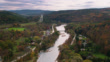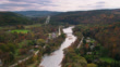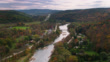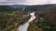 Aerial establishing shot of forest landscape and the small town of West Hartford, Vermont on a partly cloudy day in Fall.