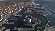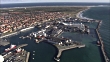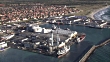 Aerial shot over a ship moored in the docks at Skagen in Denmark. - HD stock video