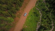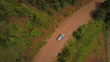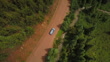 Aerial top view of car on dirt road by river stream and green trees in forest - Car in forest