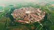 A bird's eye view captures the unique star-shaped design of Palmanova village, surrounded by lush greenery and fortifications. Explore the remarkable layout of this picturesque Italian location as the drone glides seamlessly above.