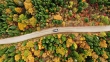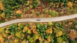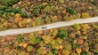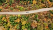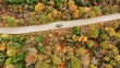 Aerial View of a vehicle on road leading trough beautiful colorful autumn forest in sunny fall, Canada