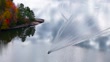 Overhead view of a boat creating ripples across Waterbury Reservoir in Little River State Park, Vermont. The calm water reflects the sky while colorful autumn trees line the rugged shoreline.