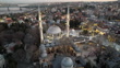 Aerial view of Eyup Sultan mosque with mahya lights during sunset in Istanbul, Turkey - 4K stock video