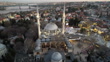 Aerial view of Eyup Sultan mosque with mahya lights during a winter sunset in Istanbul. Mahya lights is a 450-year-old Ottoman tradition which consists in installing light messages between the minarets of certain imperial mosques in Istanbul, Edirne and Bursa, during the holy month of ramadan. Eyup Sultan mosque was built in the 15th century. It is surrounded by a cemetery and sits at the foot of Pierre Loti hill, which offers sweeping views of the Golden Horn.