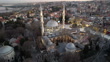 Aerial view of Eyup Sultan mosque with mahya lights during sunset in Istanbul, Turkey - 4K stock video
