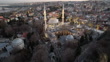 Aerial view of Eyup Sultan mosque with mahya lights during a winter sunset in Istanbul. Mahya lights is a 450-year-old Ottoman tradition which consists in installing light messages between the minarets of certain imperial mosques in Istanbul, Edirne and Bursa, during the holy month of ramadan. Eyup Sultan mosque was built in the 15th century. It is surrounded by a cemetery and sits at the foot of Pierre Loti hill, which offers sweeping views of the Golden Horn.