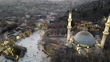Aerial view of Eyup Sultan mosque with mahya lights during a winter sunset in Istanbul. Mahya lights is a 450-year-old Ottoman tradition which consists in installing light messages between the minarets of certain imperial mosques in Istanbul, Edirne and Bursa, during the holy month of ramadan. Eyup Sultan mosque was built in the 15th century. It is surrounded by a cemetery and sits at the foot of Pierre Loti hill, which offers sweeping views of the Golden Horn.