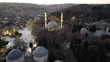 Aerial view of Eyup Sultan mosque with mahya lights during a winter sunset in Istanbul. Mahya lights is a 450-year-old Ottoman tradition which consists in installing light messages between the minarets of certain imperial mosques in Istanbul, Edirne and Bursa, during the holy month of ramadan. Eyup Sultan mosque was built in the 15th century. It is surrounded by a cemetery and sits at the foot of Pierre Loti hill, which offers sweeping views of the Golden Horn.