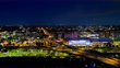 Aerial shot of Memphis, Tennessee at night looking over the ramp for the hernando de Soto Bridge towards the Renasant Convention Center.