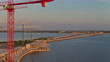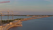 Aerial view of multiple tower cranes at the building yard on a waterfront in Charlotte Harbor, Florida, in the evening twilight. Drone-made footage with forwarding camera motion. - 4K stock video