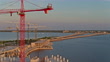 Aerial view of new construction on a waterfront in Charlotte Harbor, Florida, USA, with multiple tower cranes at the building yard. Drone-made 4K UHD B-ROLL footage.
