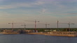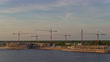 Aerial view of multiple tower cranes at the building yard on a waterfront in Charlotte Harbor, Florida, in the evening twilight. Drone-made footage with panning camera motion. - 4K stock video