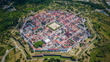 Aerial shot of Neuf-Brisach, the famous star-shaped fortress town in Alsace, France. The perfectly symmetrical geometric fortifications and grid-pattern streets are surrounded by green fields and moats. This UNESCO World Heritage Site showcases classic 17th-century military architecture. Neuf-Brisach (Neubreisach) in the department of Haut-Rhin in the region of Alsace in France. Camera ist orbiting to the left.